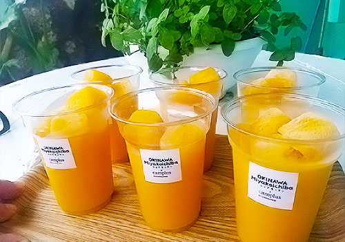 店舗厨房で作るさとうきびジュース・マンゴジュースをご注文後にすぐに製造し、お家庭又ご贈答先までお届けいたします。